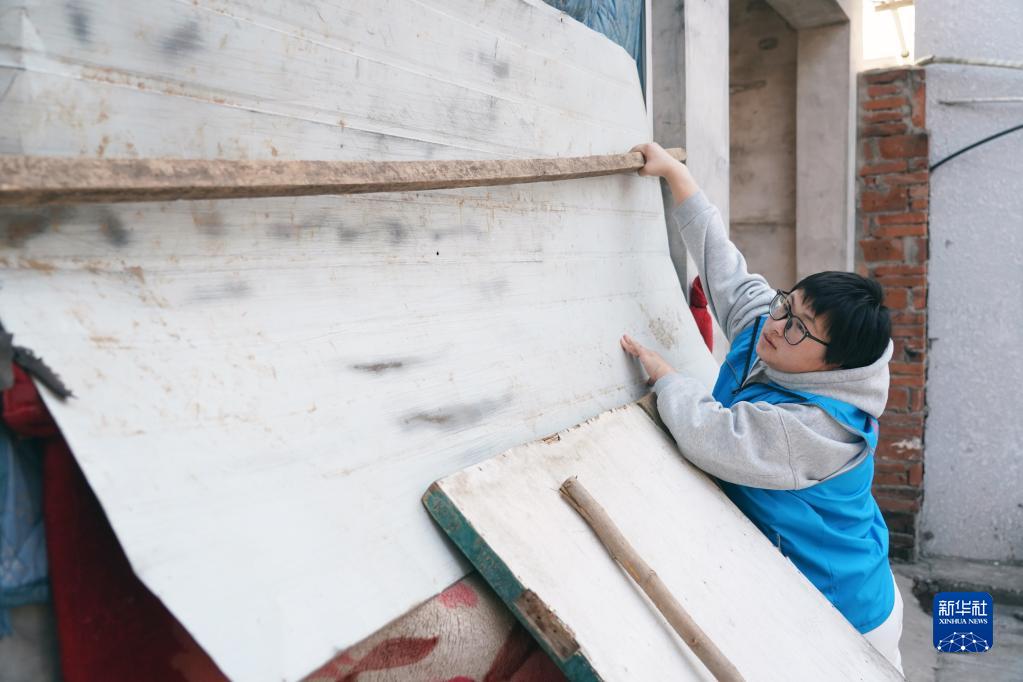 2月22日,在北京市峪口鎮(zhèn)西樊各莊村,王巖峰幫助一戶殘疾人家庭整理院子。