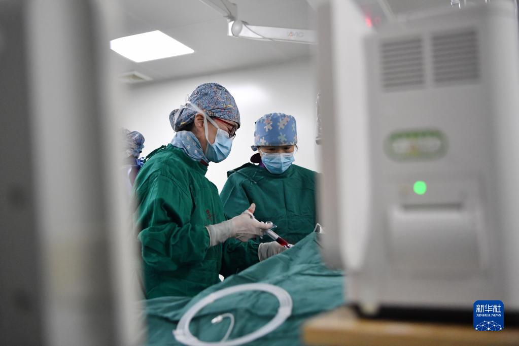 3月7日,馬娜(左)和同事在手術(shù)室為患者進(jìn)行介入手術(shù)治療。
