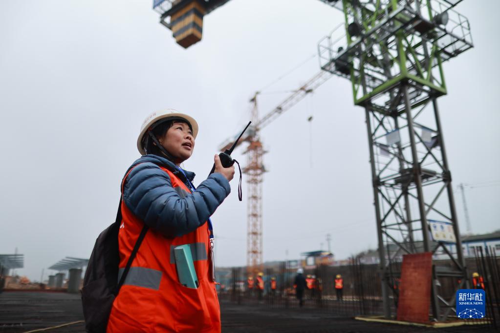 3月7日,中鐵八局女職工劉獻(xiàn)英在告知塔吊司機(jī)高鐵通過時(shí)間。