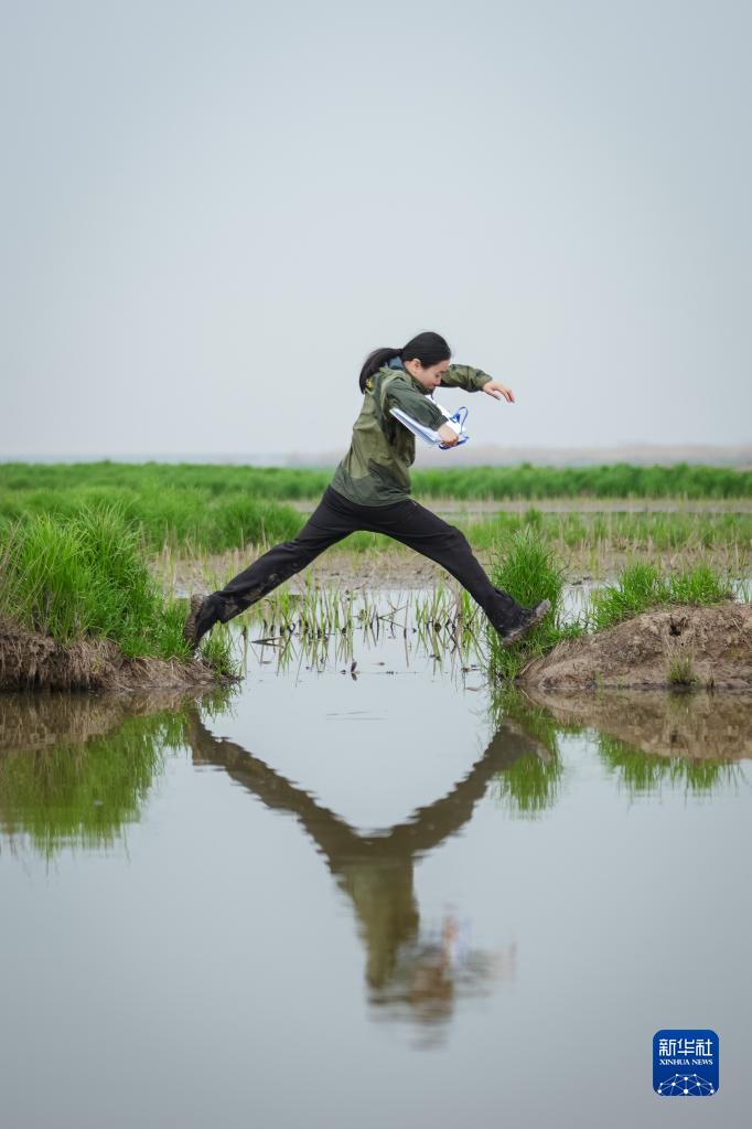 3月7日,譚文卓在進行鳥類監(jiān)測工作途中跨過一個水溝。