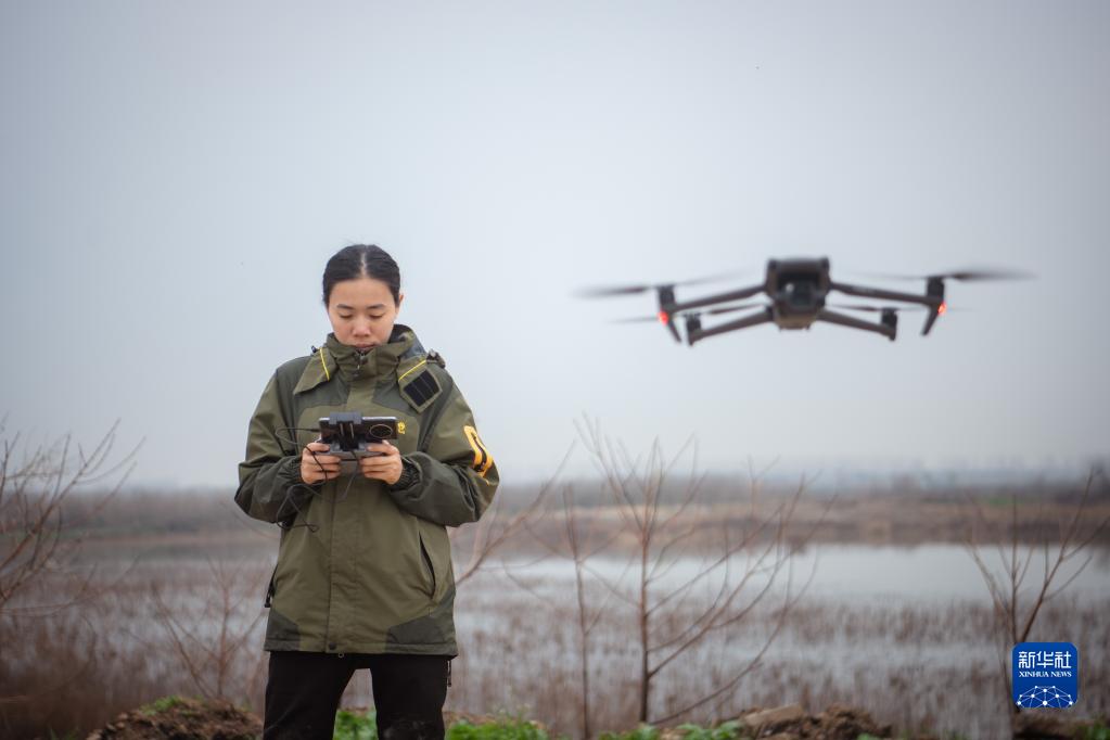 3月7日,譚文卓使用無人機拍攝記錄沉湖濕地苔草生長情況。
