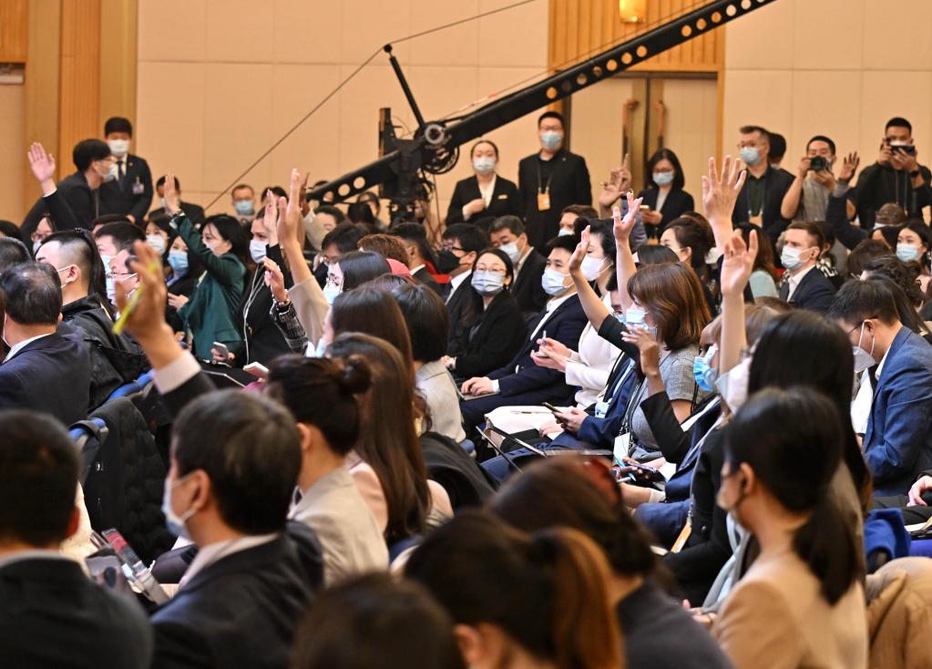 3月7日,十四屆全國人大一次會議在梅地亞中心舉行記者會,外交部長秦剛就中國外交政策和對外關系回答中外記者提問。這是記者在現場舉手提問。