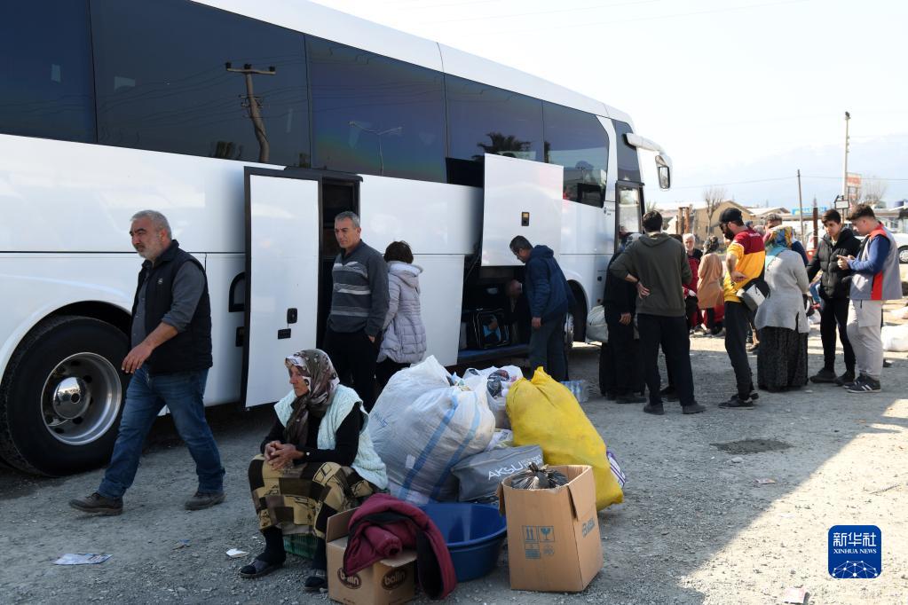 3月7日,房屋被地震摧毀的人們在土耳其哈塔伊等待前往其他城市的公共汽車。