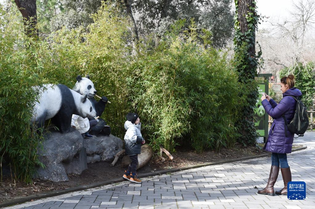 3月7日,小朋友在西班牙馬德里動物園與大熊貓雕像合影。