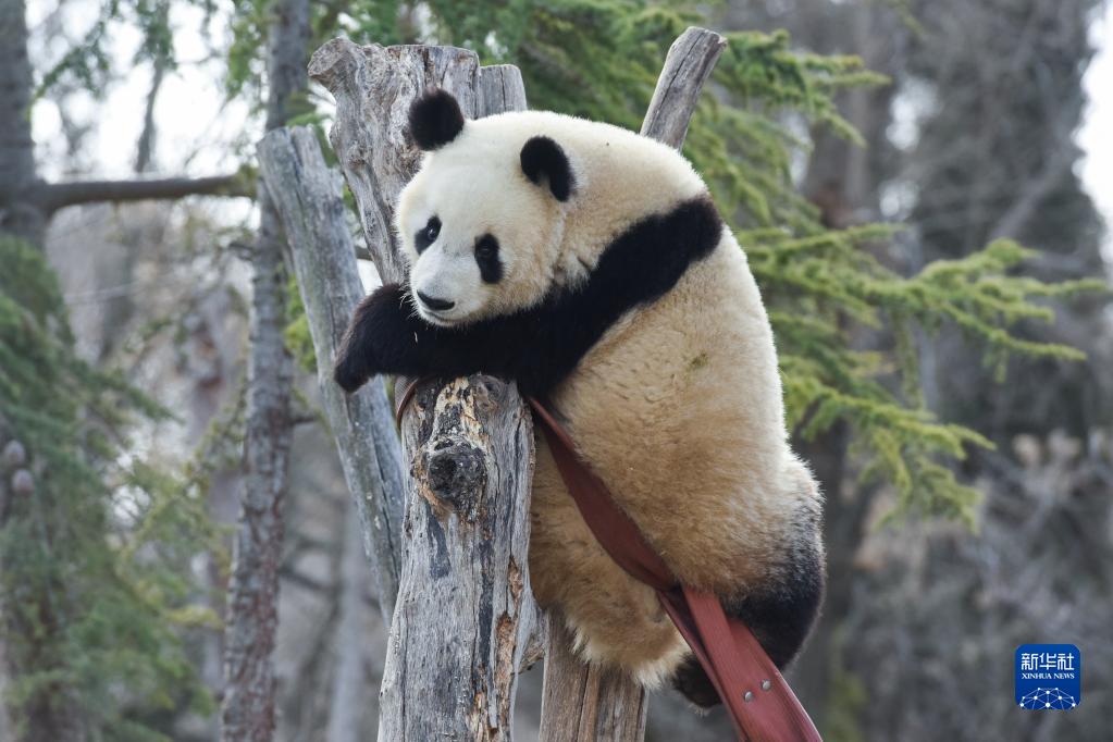 3月7日,大熊貓友友在西班牙馬德里動物園內玩耍。