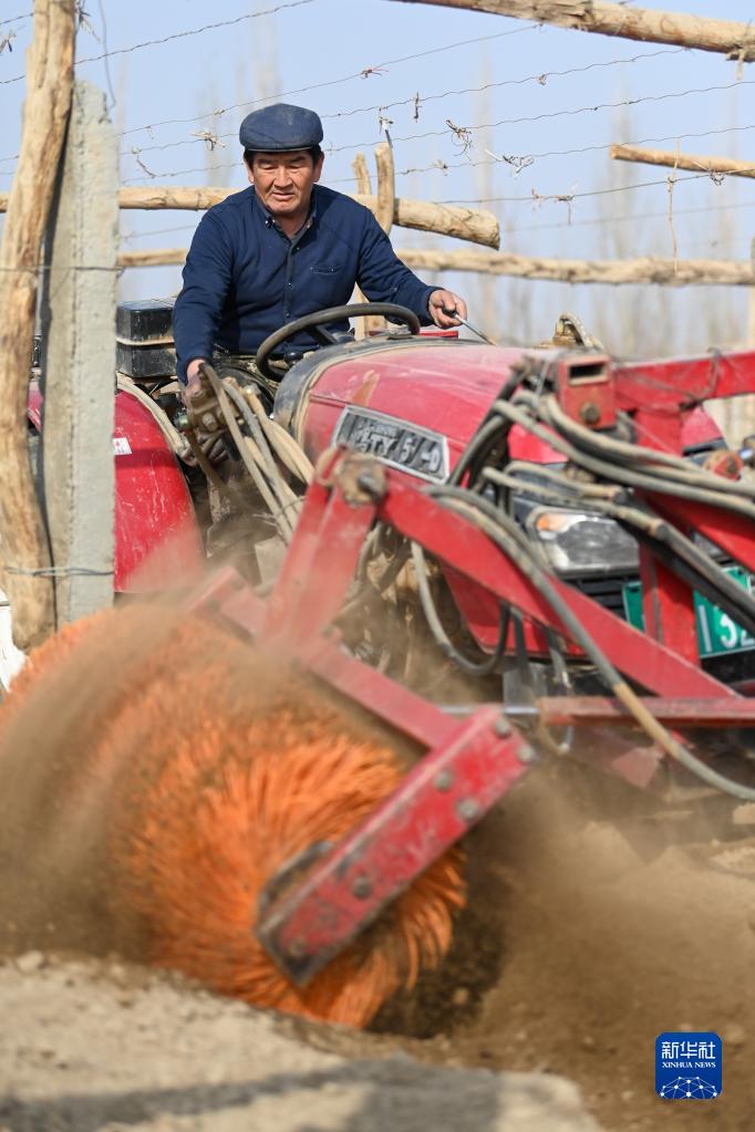 3月8日,在吐魯番市高昌區(qū)葡萄鎮(zhèn),農民操作開墩機在葡萄地里作業(yè)。