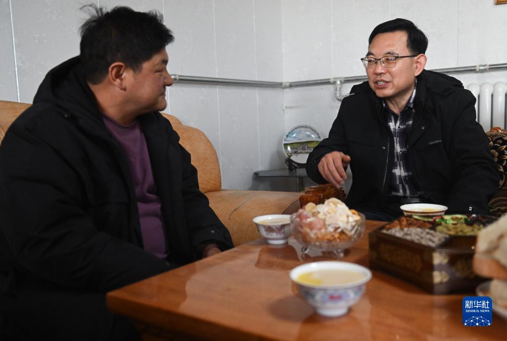 2月24日,在青海省海北藏族自治州海晏縣青海湖鄉達玉日秀村,董全民(右)與牧民東知布交流。