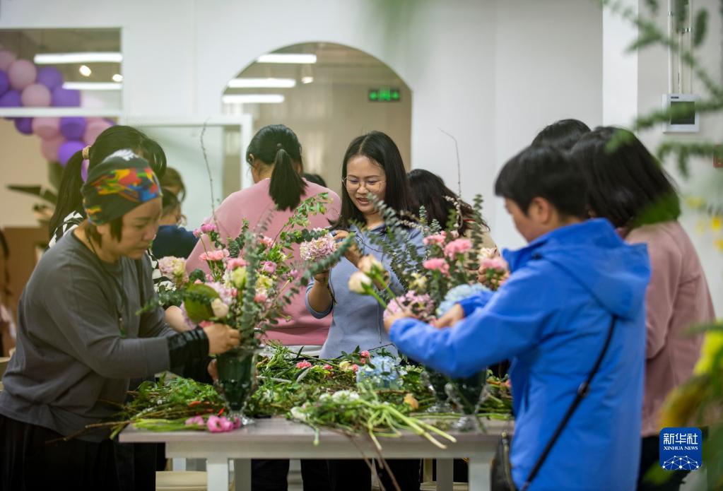 3月8日,游客在昆明斗南花卉市場體驗插花。