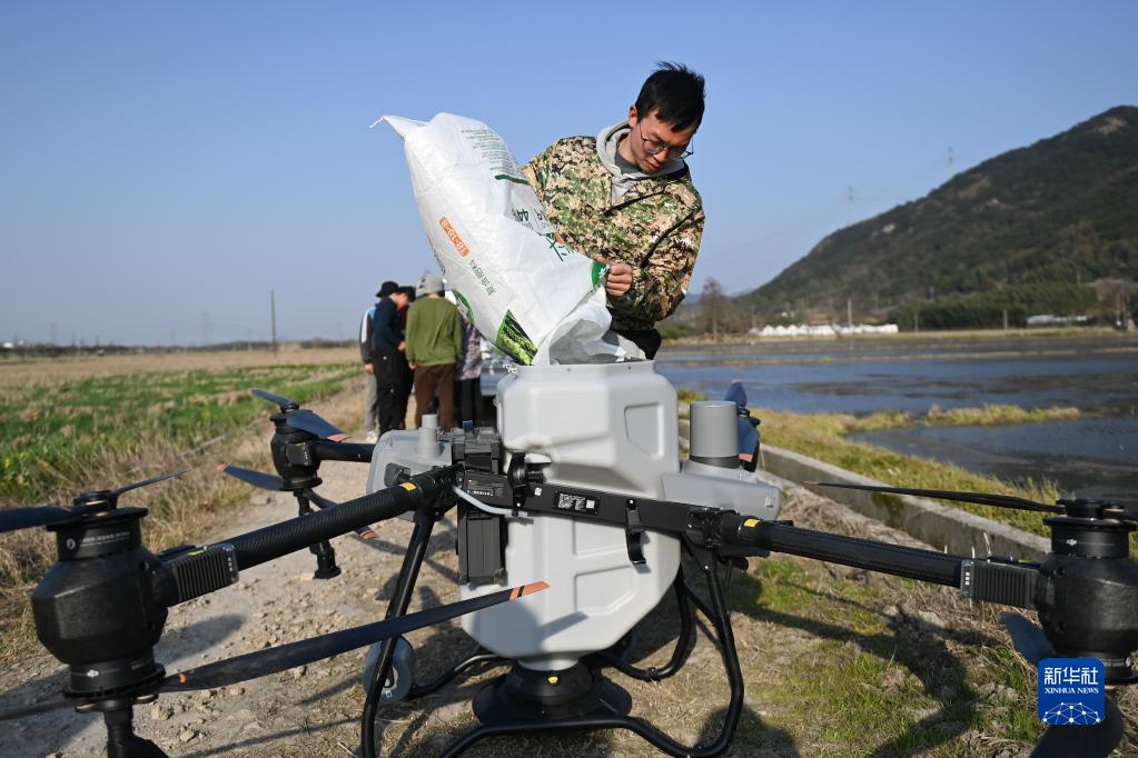 在寧波市奉化區西塢街道四維村,種糧戶將肥料倒入植保無人機的裝置中(3月7日攝)。