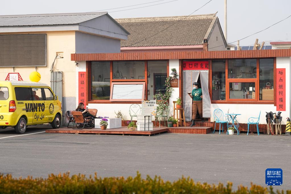 在北京市密云區金叵羅村的西口研食社外,劉甜恬(右)為來店里的客人上甜點(2023年3月7日攝)。