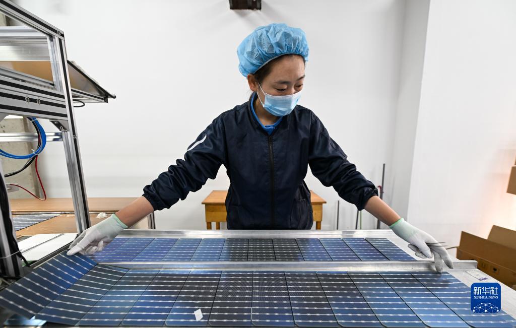 在天津一家新能源公司生產(chǎn)車間,工作人員在加工光伏組件(3月7日攝)。