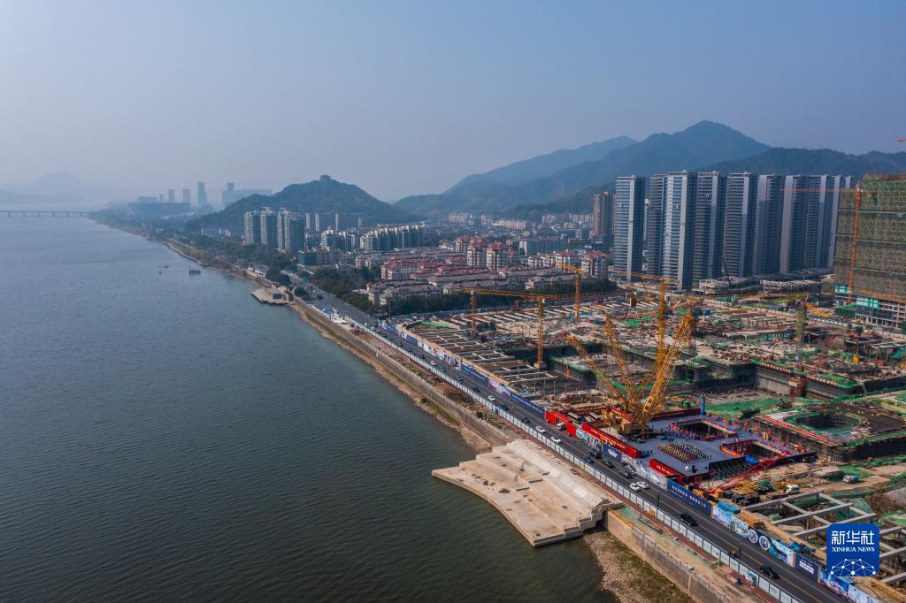 空中俯瞰富春江畔秦望通道工程過江隧道江北工作井施工現(xiàn)場(3月9日攝,無人機照片)。