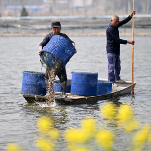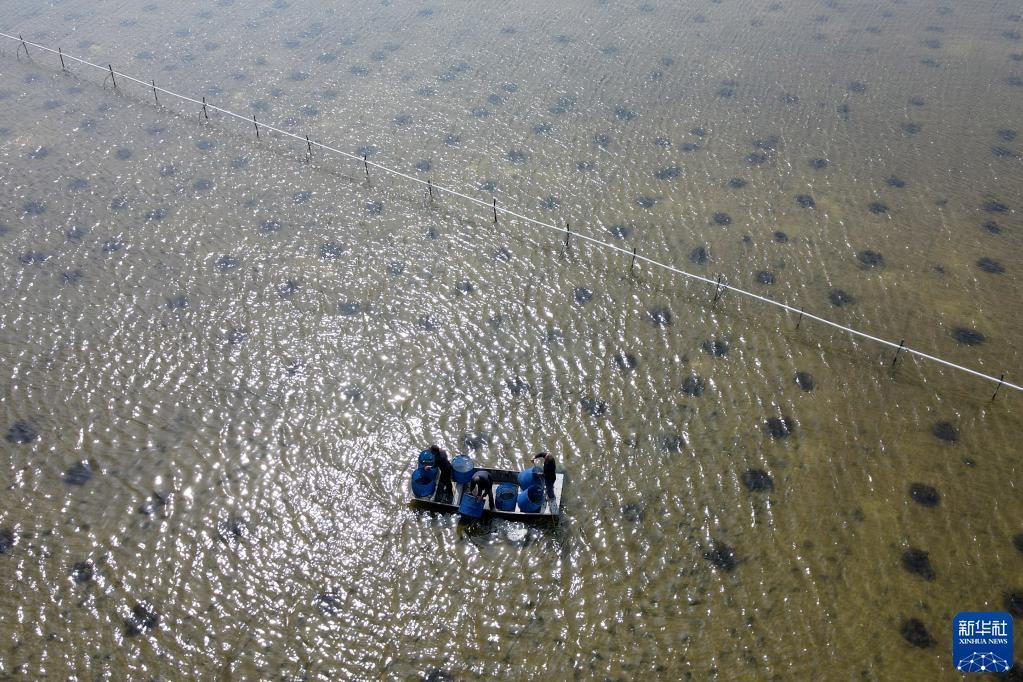 3月9日,在安徽省蚌埠市五河縣小圩鎮,蟹農在投放蟹苗(無人機照片)。