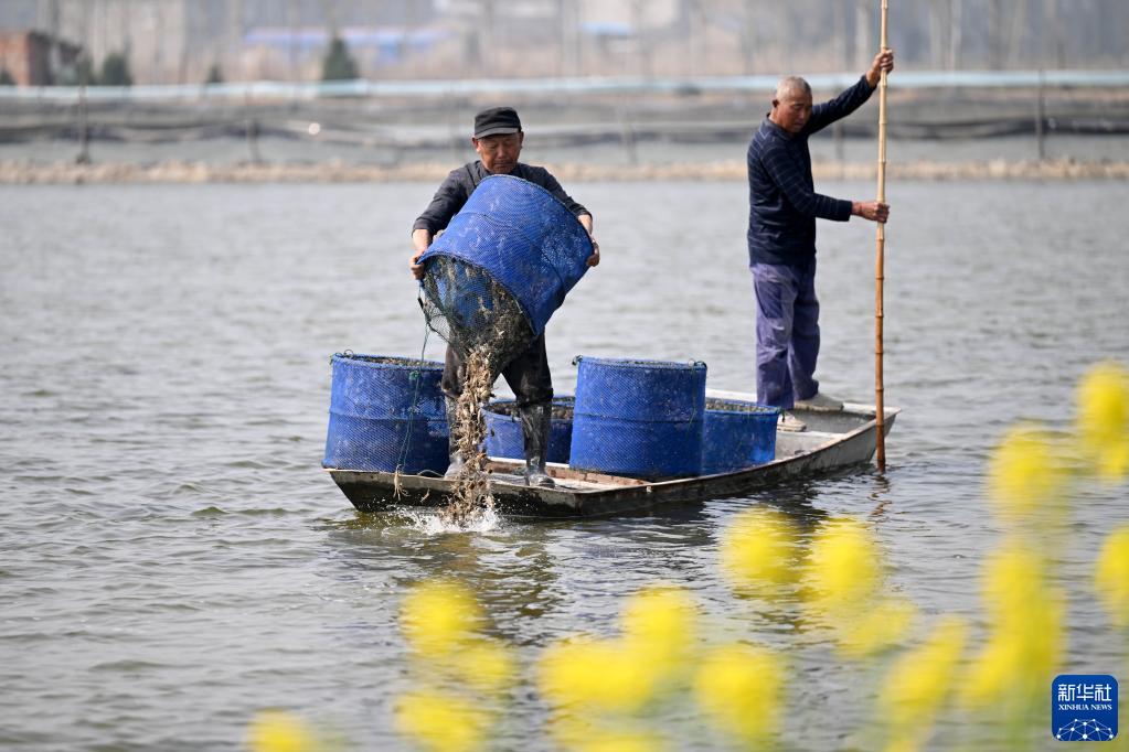 3月9日,在安徽省蚌埠市五河縣小圩鎮,蟹農在投放蟹苗。