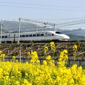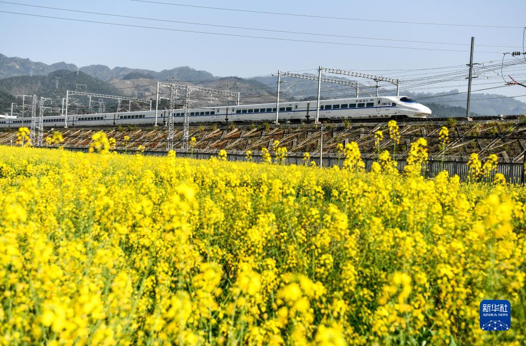 時下,在貴州省黔東南苗族侗族自治州,油菜花陸續盛開,動車組列車穿行其間,美不勝收。