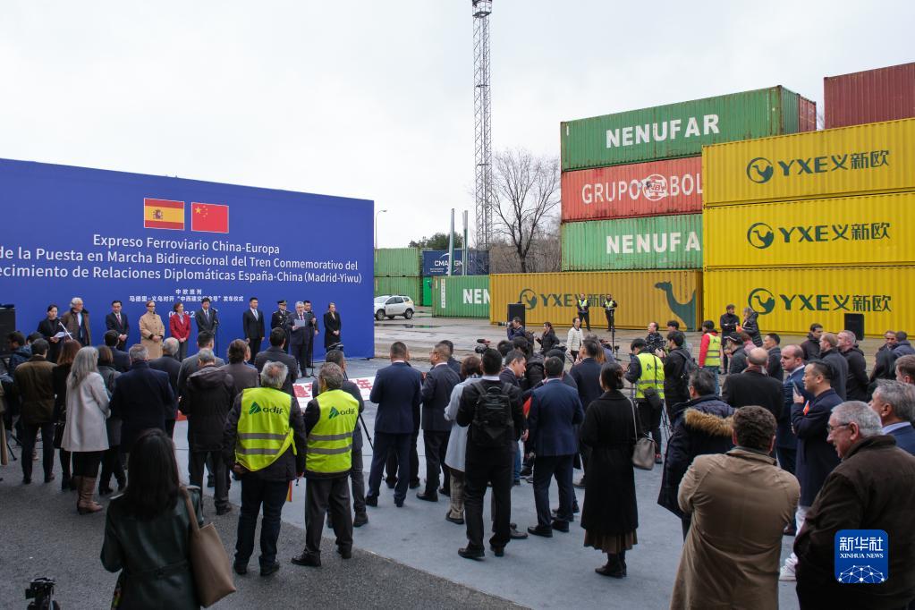 3月9日,人們在西班牙馬德里參加“中西建交紀念號”中歐班列發車儀式。