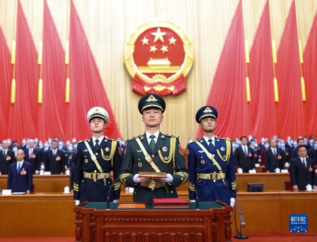 3月10日,中華人民共和國第十四屆全國人民代表大會第一次會議憲法宣誓儀式在北京人民大會堂舉行。主席臺上,3名禮兵護送《中華人民共和國憲法》入場。