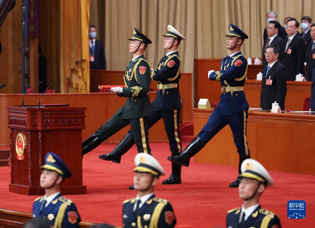 3月10日,中華人民共和國第十四屆全國人民代表大會第一次會議憲法宣誓儀式在北京人民大會堂舉行。主席臺上,3名禮兵邁著正步護送《中華人民共和國憲法》入場。