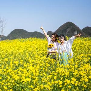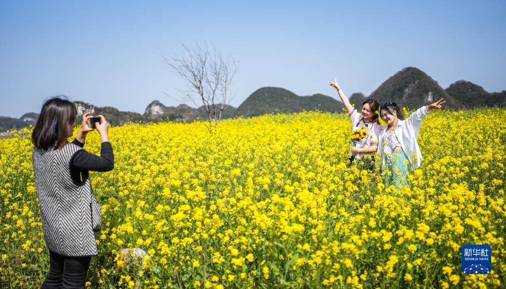 3月9日,游客在貴州省六盤水市六枝特區木崗鎮瓦窯村的油菜花田里拍照游玩。