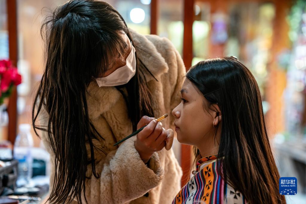 3月8日,游客(右)在獨(dú)克宗古城里的一家藏裝店化妝。