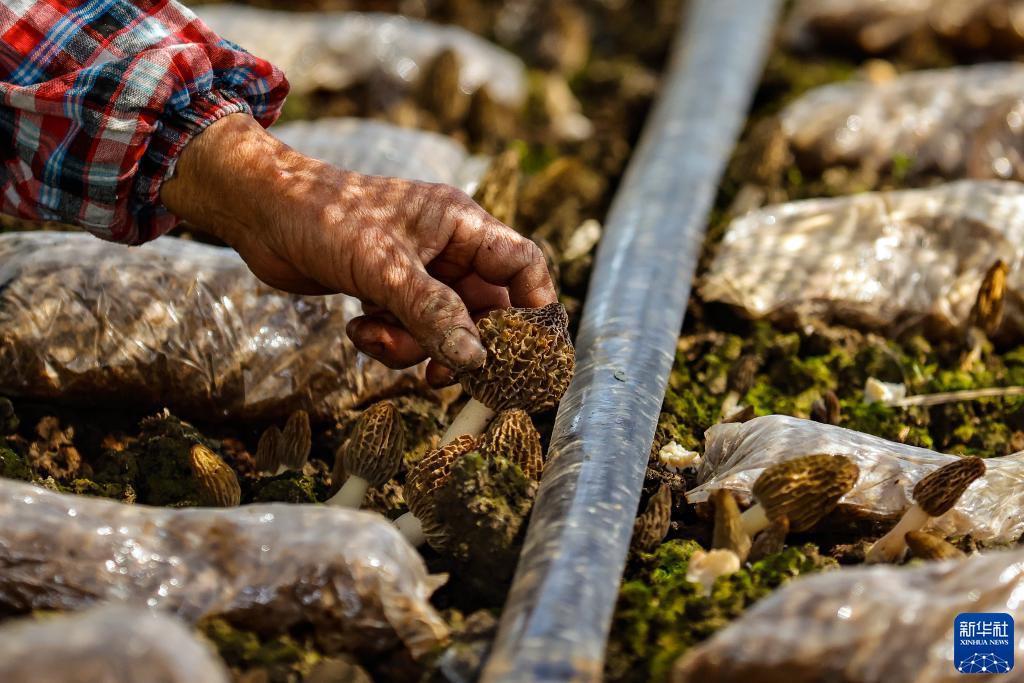 在四川省成都市大邑縣新場古鎮燈籠社區的一處種植大棚里,當地村民在采摘羊肚菌(3月8日攝)。