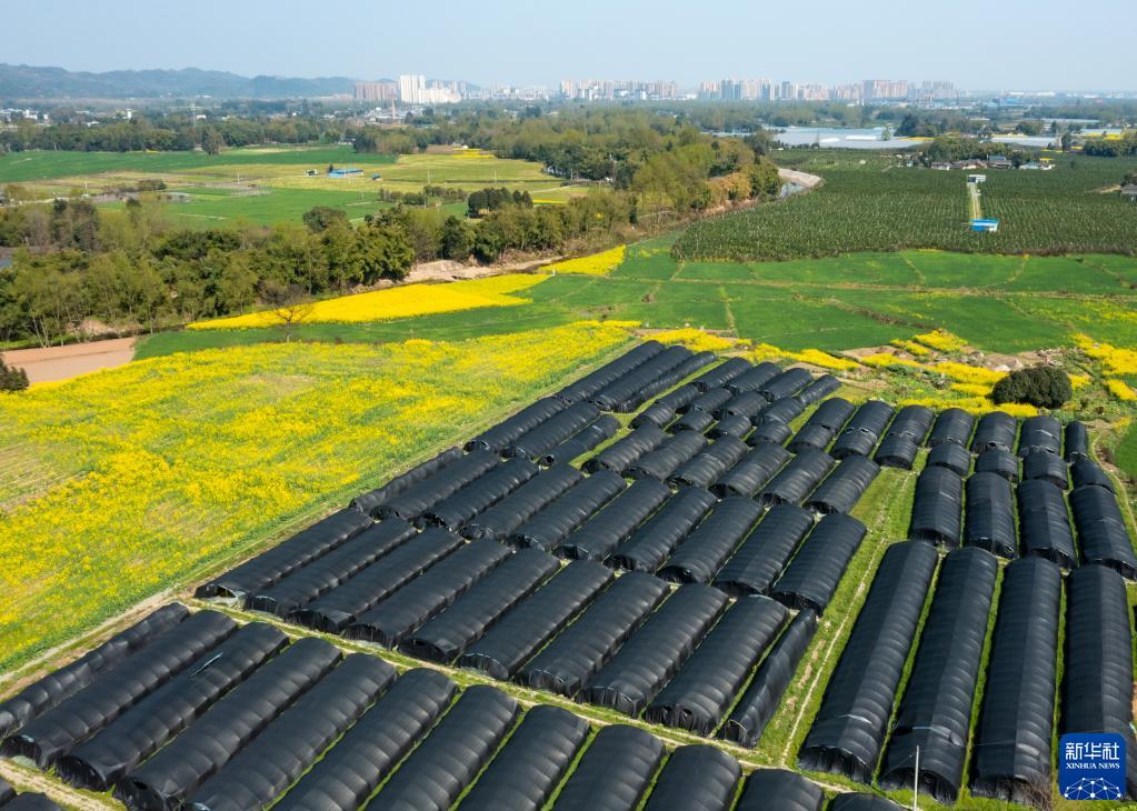 這是在四川省成都市大邑縣新場古鎮燈籠社區拍攝的羊肚菌種植大棚(3月8日攝,無人機照片)。