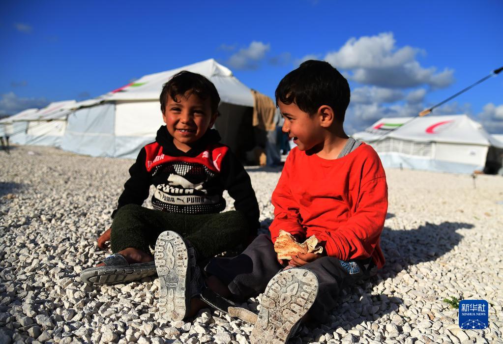 這是3月9日在敘利亞杰卜萊的一處災民安置營內拍攝的兒童。