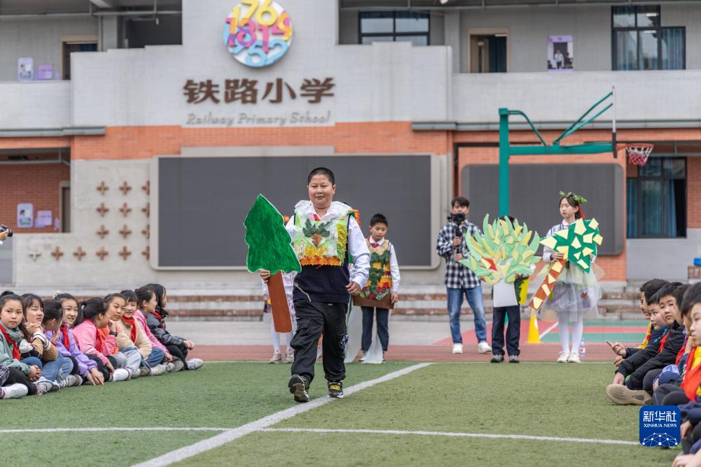 當(dāng)日,為迎接3月12日“植樹(shù)節(jié)”,重慶市九龍坡區(qū)鐵路小學(xué)組織師生舉辦“我為世界添片綠”植樹(shù)節(jié)環(huán)保系列服裝設(shè)計(jì)展示活動(dòng)。40余名學(xué)生在學(xué)校老師和美術(shù)義工的指導(dǎo)下,收集身邊各種可以利用的廢棄物,發(fā)揮想象力,制作成環(huán)保服裝,倡導(dǎo)植綠、愛(ài)綠、護(hù)綠的生態(tài)理念和綠色生活方式。