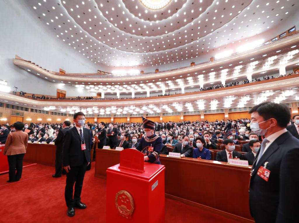 3月11日,十四屆全國人大一次會議在北京人民大會堂舉行第四次全體會議。這是代表在投票。