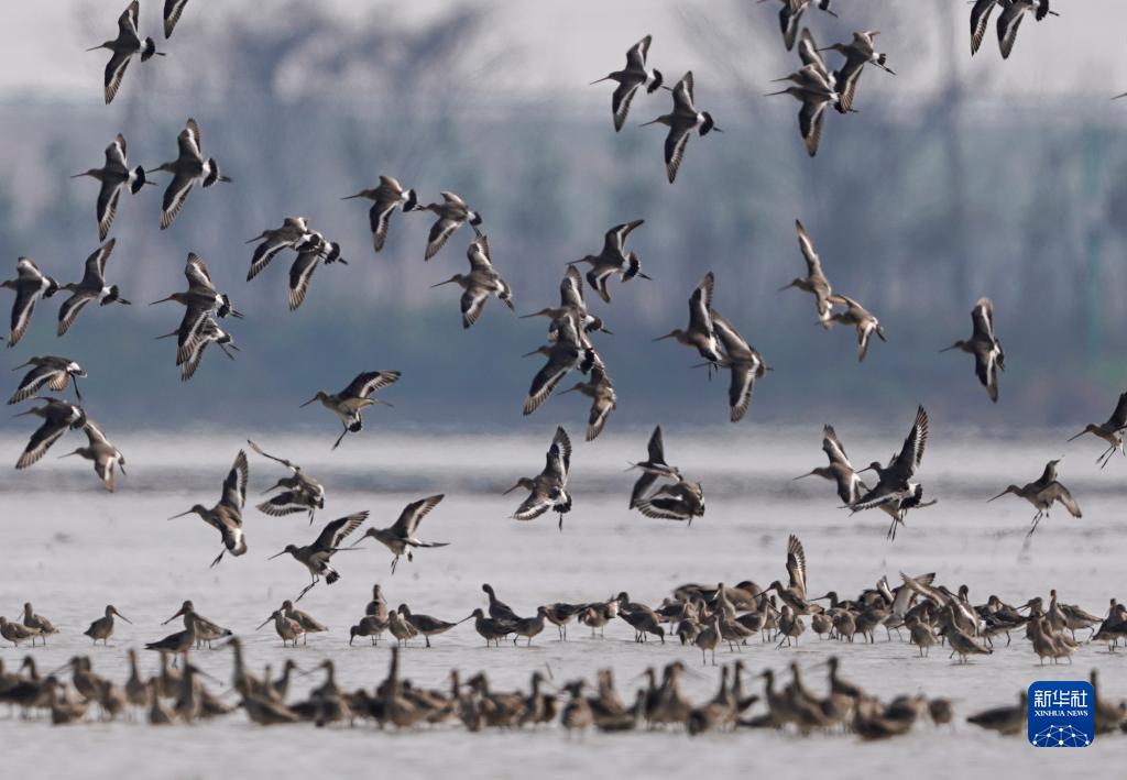 隨著氣溫逐步升高,大批候鳥在江西鄱陽湖區陸續集結起飛,開始北歸之旅。