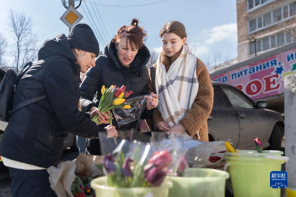 3月8日,女士們在俄羅斯符拉迪沃斯托克街頭采購鮮花。