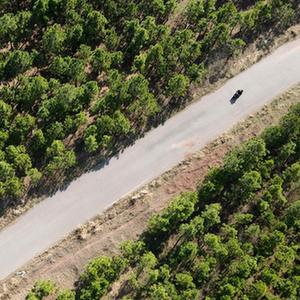 3月10日,張偉騎著電動車在五河縣朱頂鎮陸沖山的山林中巡護(無人機照片)。