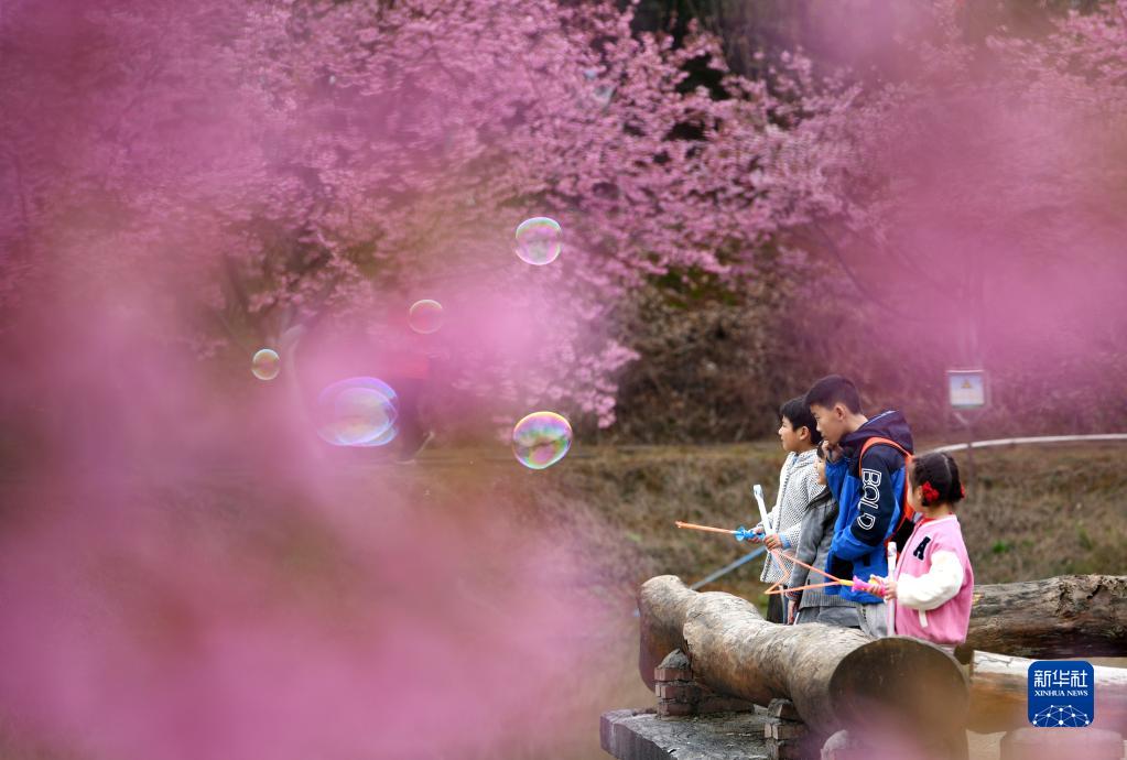 3月4日,小朋友在湖南省常寧市羅橋鎮(zhèn)櫻花園內(nèi)玩耍。