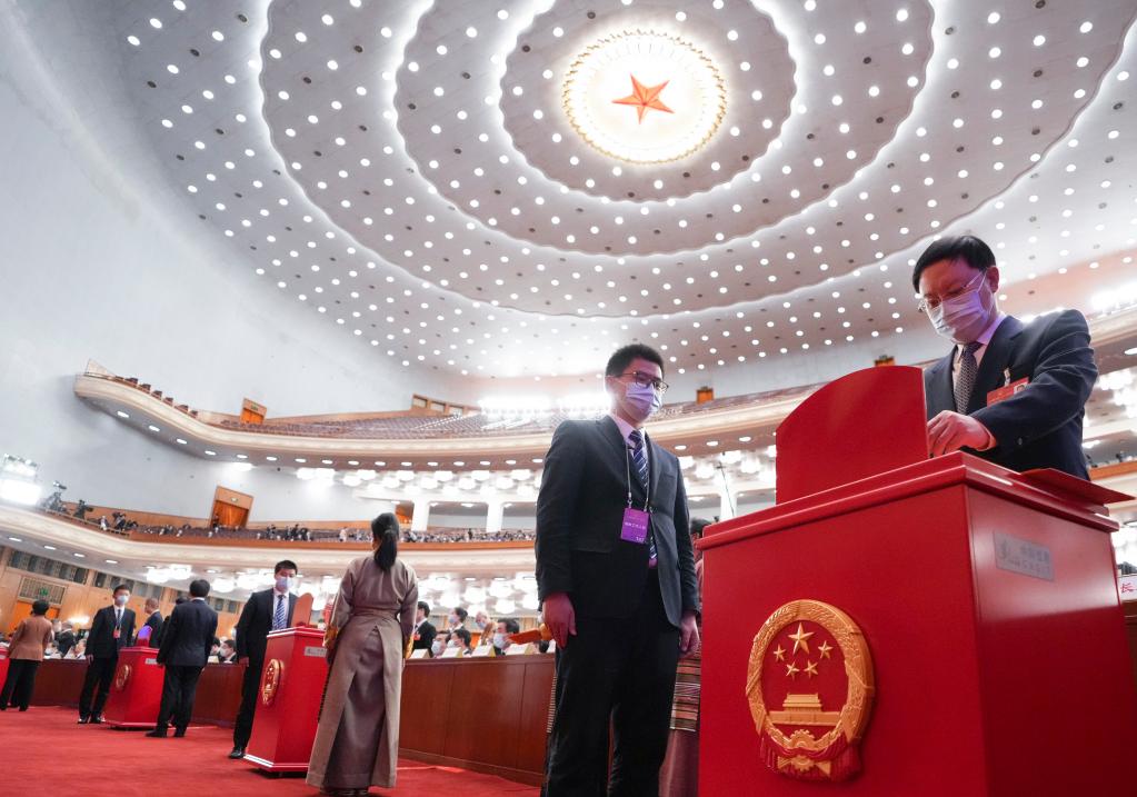 3月11日,十四屆全國人大一次會議在北京人民大會堂舉行第四次全體會議。這是代表在投票。