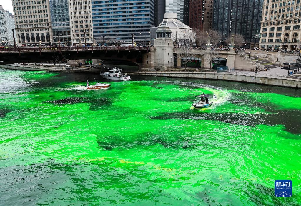 3月11日,美國芝加哥市中心的芝加哥河被染成綠色,迎接即將到來的圣帕特里克節。