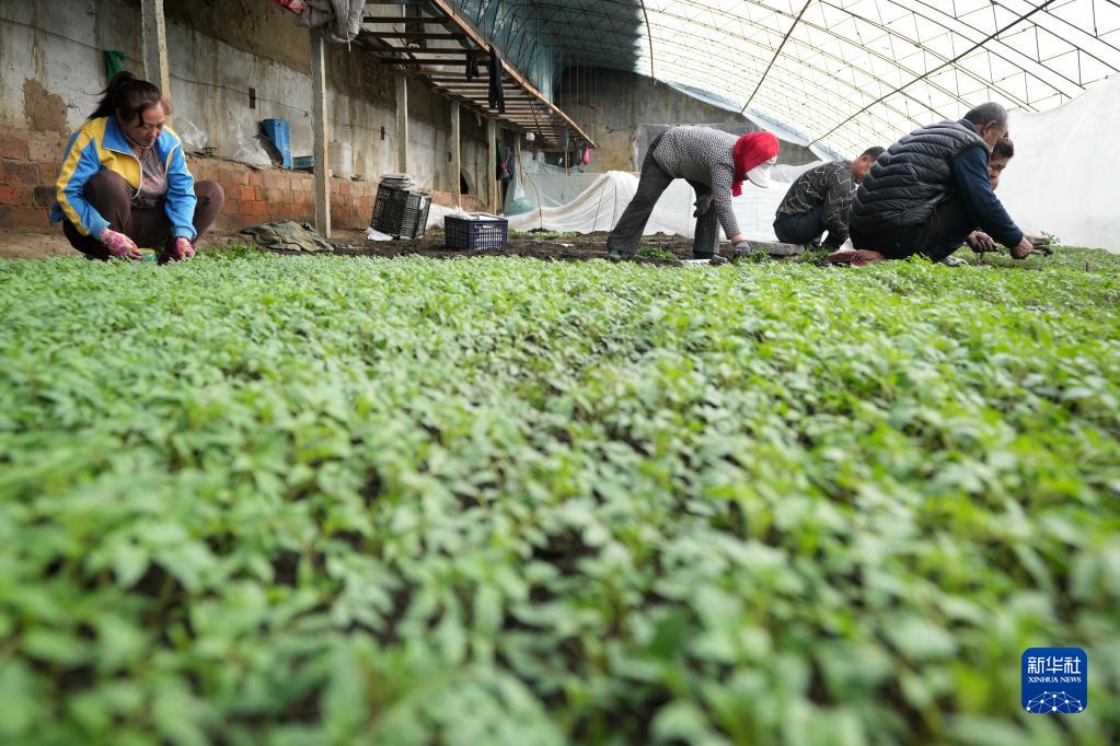 3月9日,在黑龍江省佳木斯市郊區(qū)長青鄉(xiāng)萬興村棚室內,村民在移栽西紅柿秧苗。