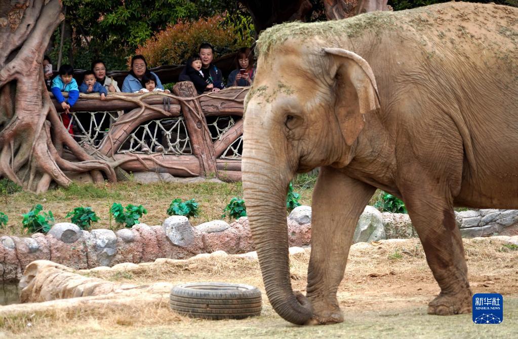 3月24日,游客在銀基動物王國內觀看大象。