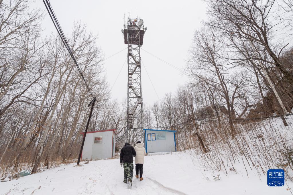 3月23日,在中國龍江森工集團沾河林業(yè)局有限公司施業(yè)區(qū),王劉洋(左)和徐盼互相攙扶著走向彩芹瞭望塔。他們將上塔調試設備,為正式開始新一年的森林防火瞭望工作做準備。
