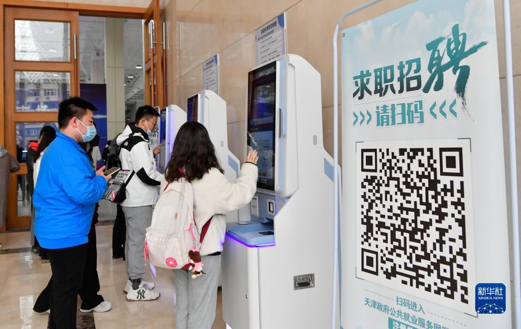 3月25日,在中國(天津)人力資源發展促進中心,求職者通過自助服務機器查看招聘信息。