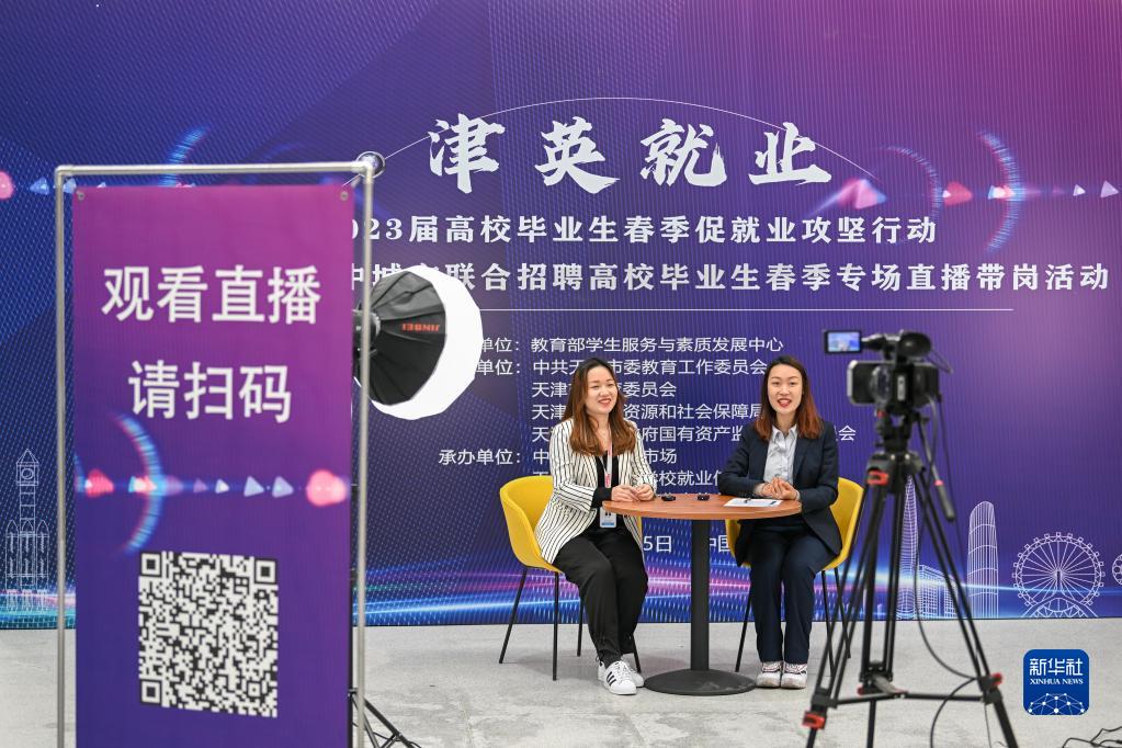 3月25日,在中國(guó)(天津)人力資源發(fā)展促進(jìn)中心,中國(guó)北方人才市場(chǎng)中天人力工作人員與招聘企業(yè)負(fù)責(zé)人以線上直播的方式為求職者提供服務(wù)。