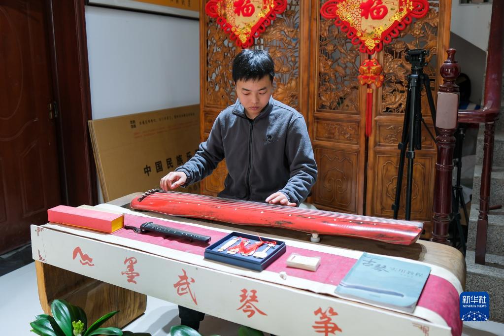 3月25日,斫琴師徐亞沖在徐場村墨武琴坊里彈奏古琴。