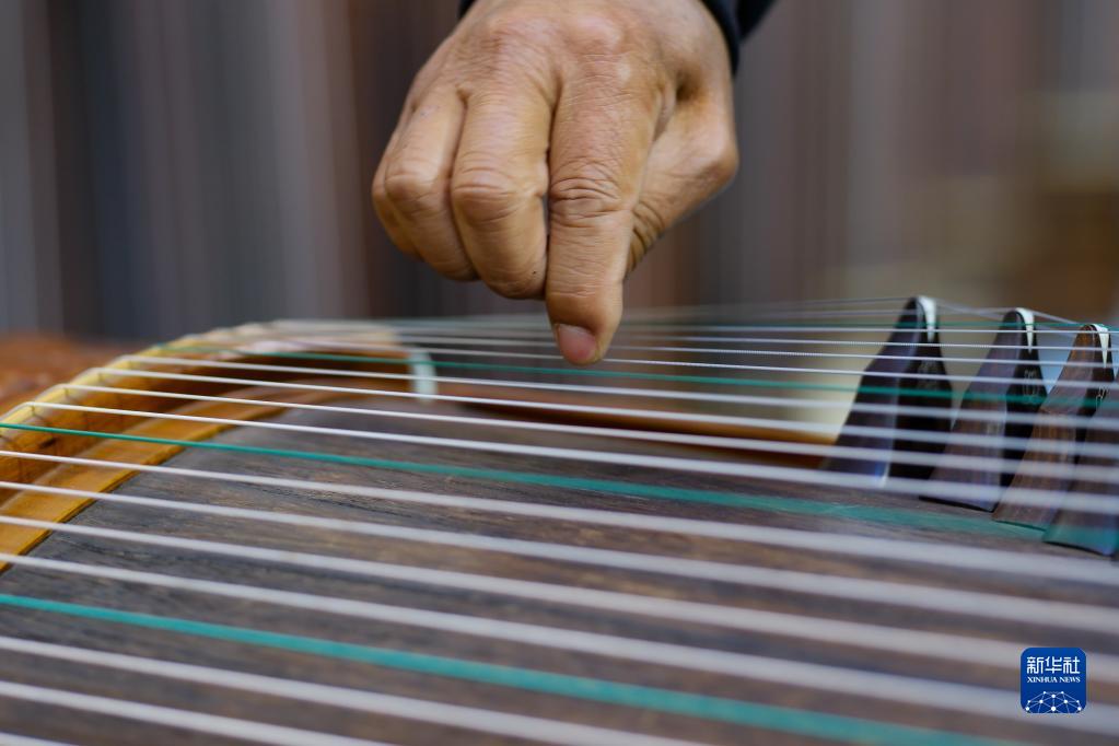 3月25日,村民在徐場村一處民族樂器家庭作坊里進行古箏試音。