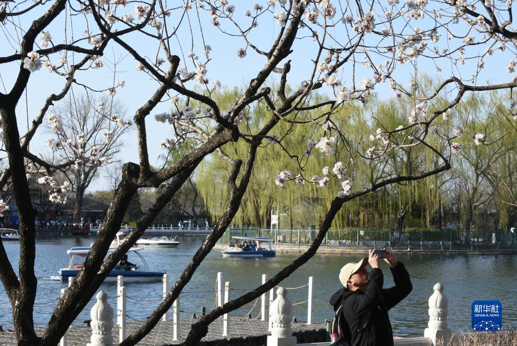 3月25日,一名游客在北京什剎海附近拍攝。