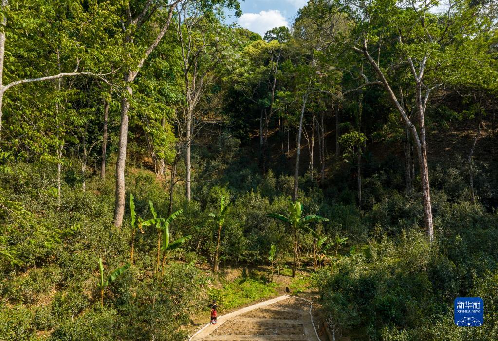 3月25日,景邁山茶農葉寶在古茶林里采茶(無人機照片)。