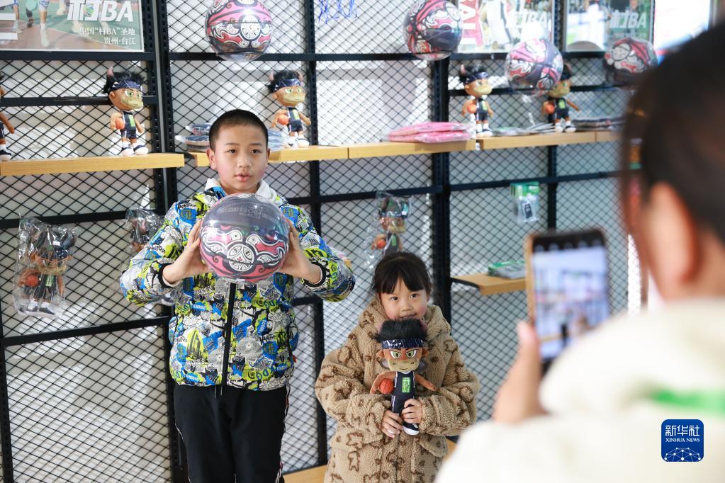 3月25日,兩名兒童在“村BA官方線下體驗館”內拍照留念。
