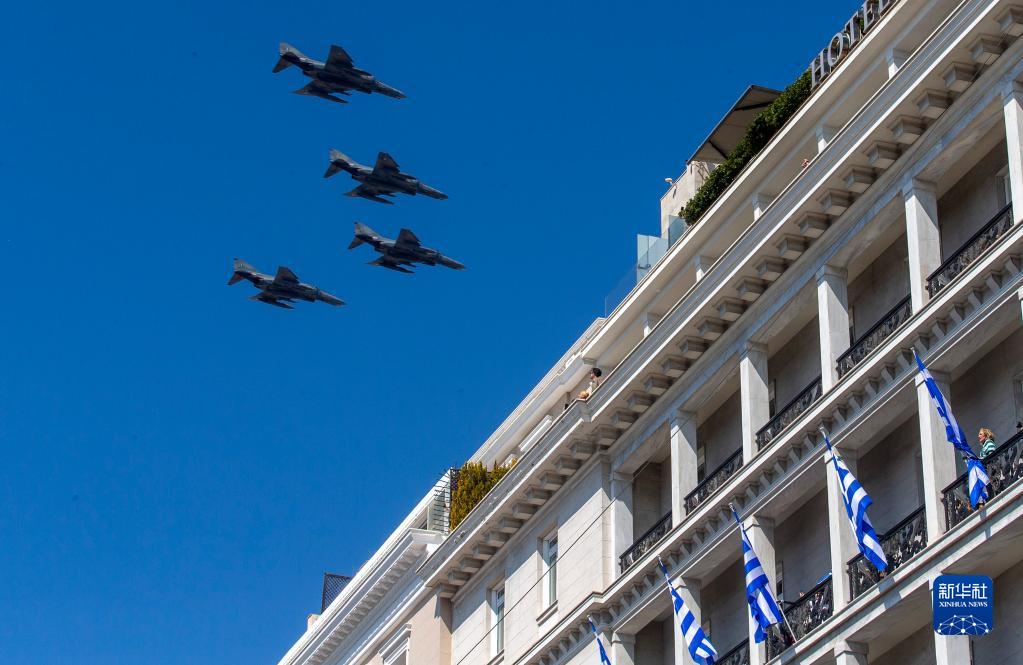 這是3月25日在希臘雅典獨(dú)立日閱兵儀式上拍攝的戰(zhàn)斗機(jī)。