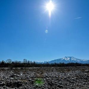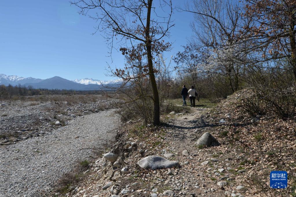 3月25日,在意大利皮埃蒙特大區(qū),人們走在干涸的杰索河河床附近。