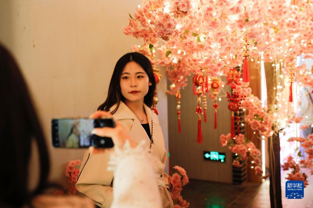 3月25日,游客在“黃河食渡文化夜市”拍照留念。