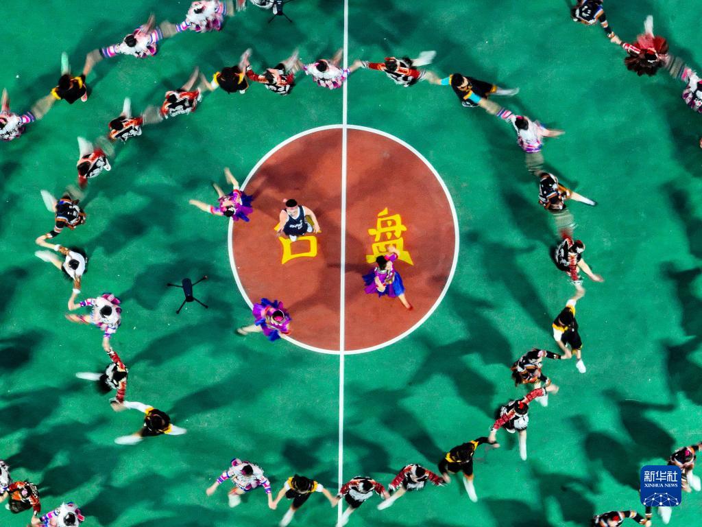 3月26日,比賽開始前,苗族同胞在“村BA”賽場上跳舞(無人機(jī)照片)。