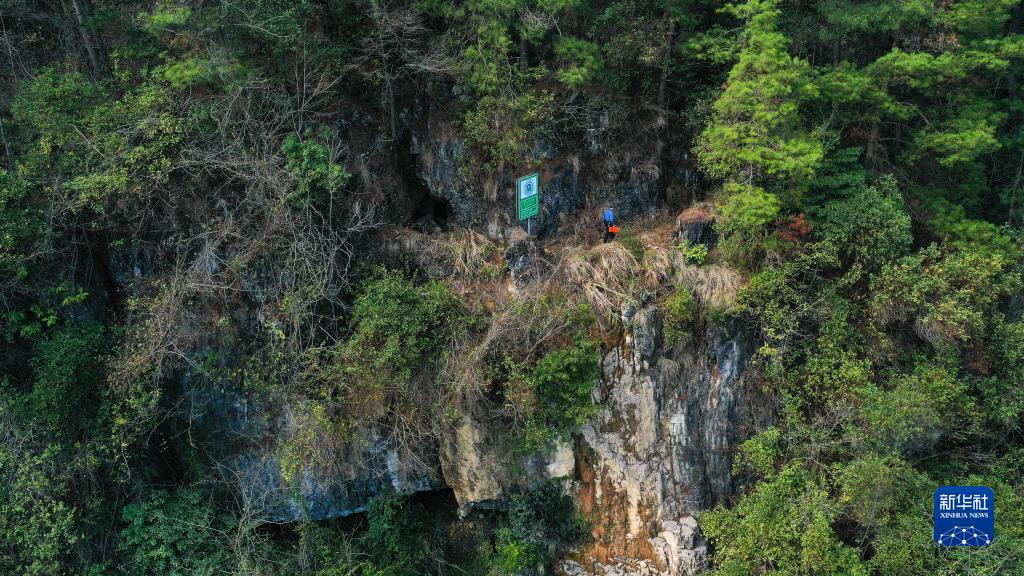 在貴定縣盤江鎮馬場河村,管水員陳光明在半山腰上的溶洞水源點附近巡護水管(3月23日攝,無人機照片)。